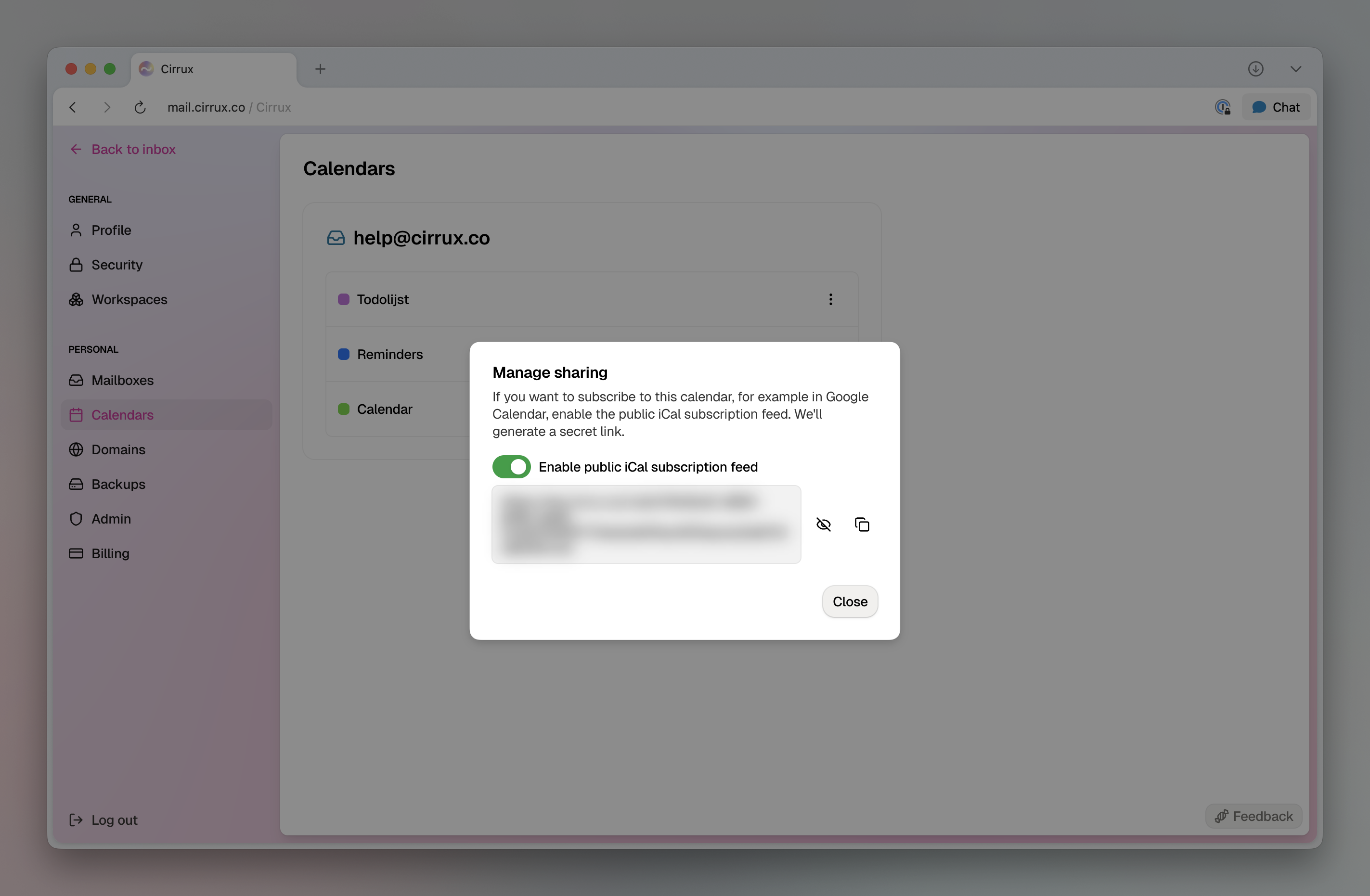 I’ve been spending the majority of my time working on tackling a lot of smaller issues (see below) and working on Cirrux Sync, but there’s one fun new feature: you can now enable a secret public link to your calendar. If you’re like me, work and life is a mix, and having this link allows you to see your personal calendar side by side, for example if you’re using Google Calendar at work.